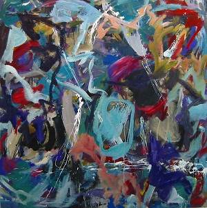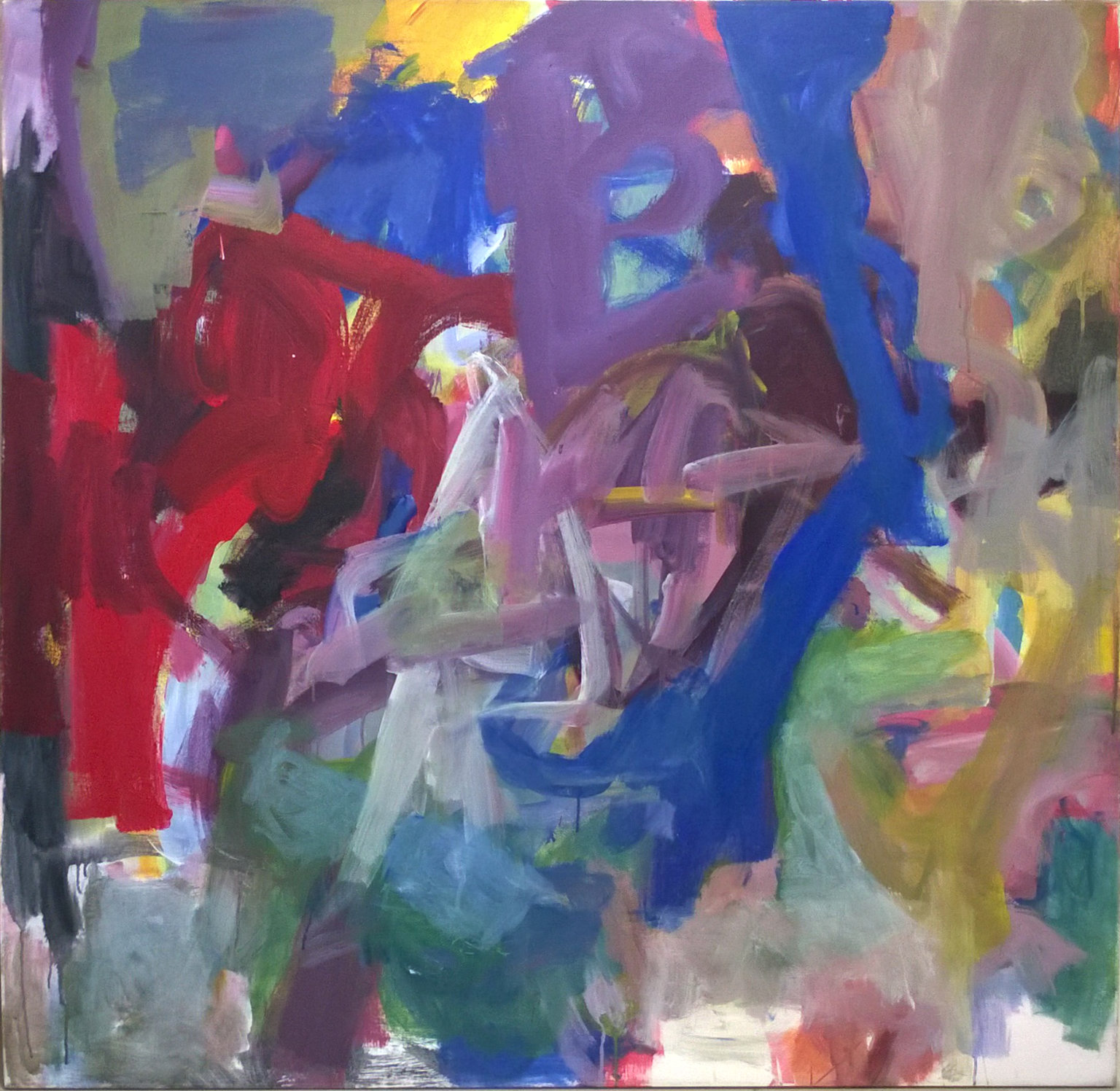 Colors include purples, blues, greens, reds, yellow. Purples in TC / C. Large red area in TL / CL. Small amount of white space in BR. Small area of yellow in TC. Verso. Remnants of mostly illegible sticker on TL from Stremmel Gallery. Label on CL stretcher bar: IN THE WILD COUNTRY / Neltje / acrylic on canvas / 60" x 60" $3000. Next label: In the Wild Country / 1991, acrylic on canvas, 60 x 60 inches / $3,000. Stamped on C vertical stretcher bar: DAVID DAVIS / FINE ART MATERIALS, INC. / 346 LAFAYETTE ST. NYC 10012 / 212-932-7100/800-237-0061. Stretcher can be keyed.