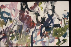 White space throughout, large area in TR. Colors are dark pinks, greens, blues, black. 2 dark pink drips in TL and BR. Black / gray lines in TR, with drips into CR. Verso. Sticker on C stretcher bar: NELTJE Top / You Cannot Take Yourself In I / Acrylic on Canvas 1991 / 42" x 64" 31. TL canvas edge: INside. Stretcher has screws and can be keyed.