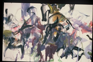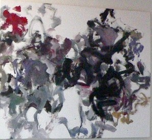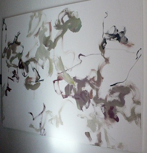 Triptych. Primarily white space with greens, grays,purples, black. Green drips in TL, CL, and BC. Purple in CR. Black in BC. Verso. TL canvas edges: INSIDE Top. TC vertical stretcher bar: 60 / Gliding / O'er / All / A. Stamped on CL stretcher bar: 48. TR canvas edge: outside. Stretcher has screws and can be keyed.