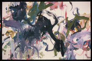 White space throughout, larger area in TR. Colors include black, purples, greens, pinks, blues. Pink drip from TC to BC. Green drips across bottom. C is primarily black and purple. Verso. Sticker on C stretcher bar: NELTJE Top / You Cannot Take Yourself In III / Acrylic on Canvas 1991 / 42" x 64" 33. TR canvas edge: 5 INSIDE. Stretcher has screws and can be keyed.