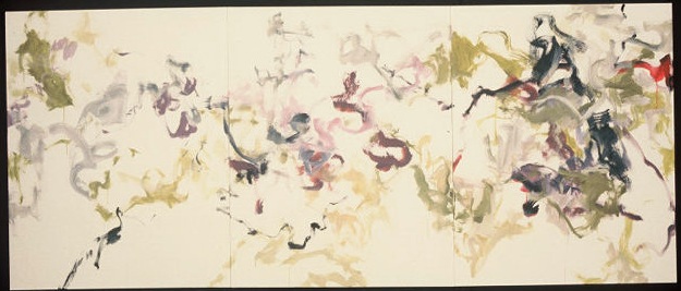 Triptych. A lot of white space with pinks, greens, grays, tans. Green drips in BL. Tan drips in CR / BR. Pink drips in C / CR. Dark pink across C. Verso. TL canvas edges: INSIDE MiddLE Top. TC vertical stretcher bar: 60 / B. TR canvas edge: INSIDE MiddLE. Sticker on C stretcher bar: NELTJE / Gliding O'er All / Acrylic on Canvas Triptych <sic> / 1991 144 1/2" x 60". Stretcher has screws and can be keyed.