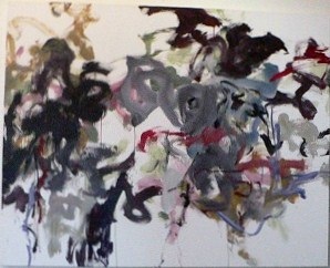 Primarily white space. Colors are greens, pinks, black, tans. A few drips in C. A little red in CL. Verso. TR stretcher frame, sticker: NELTJE / I See In You The Estuary / Acrylic on Canvas 1991 / 72" x 55".