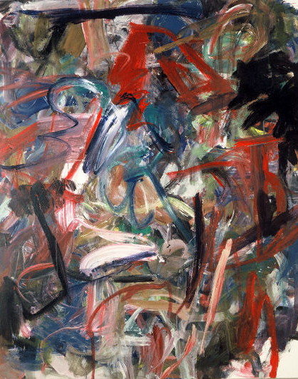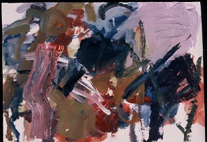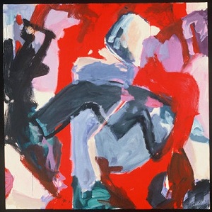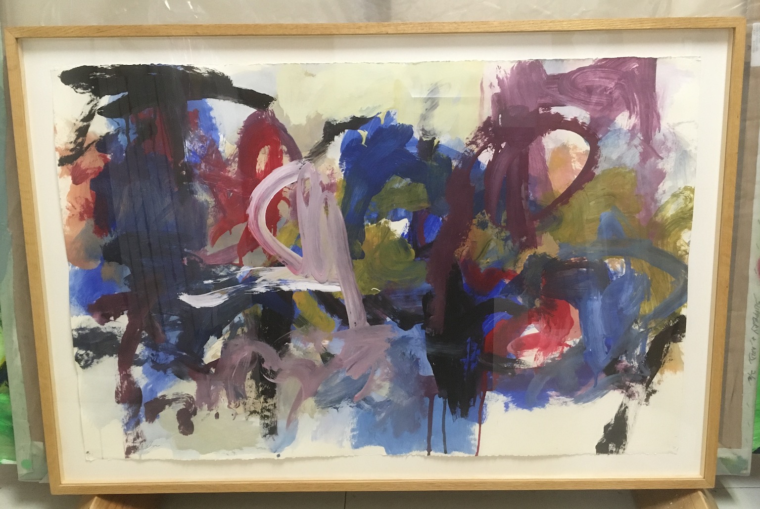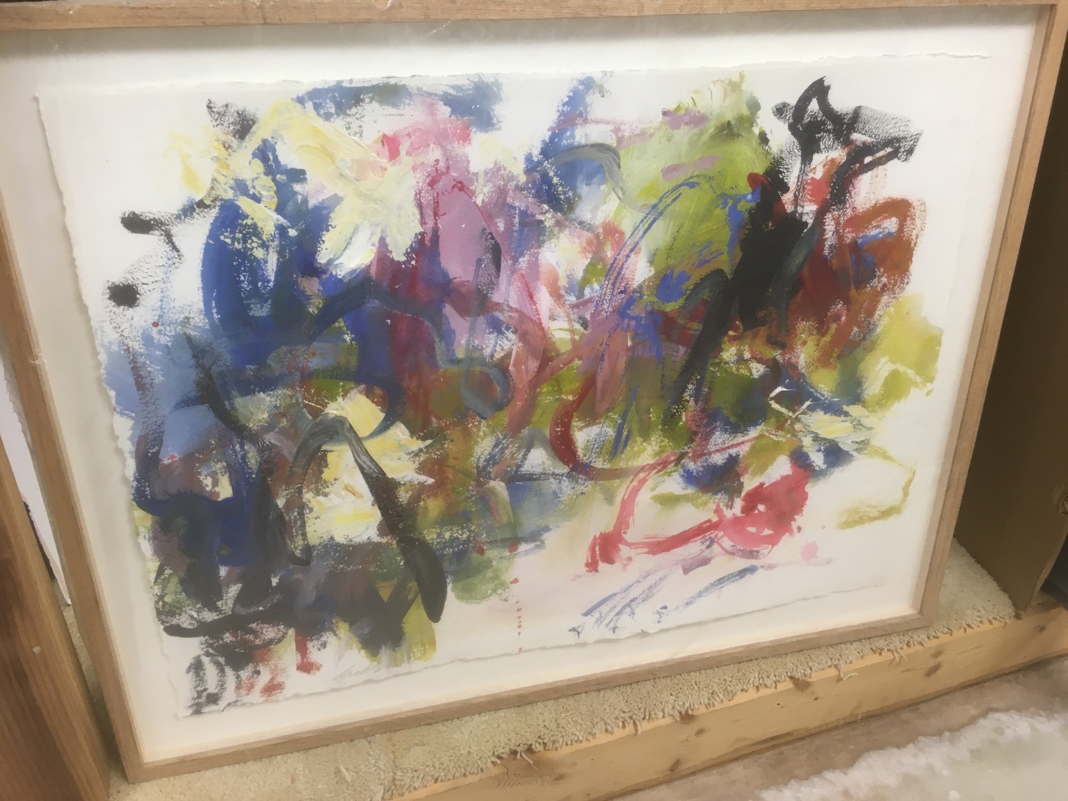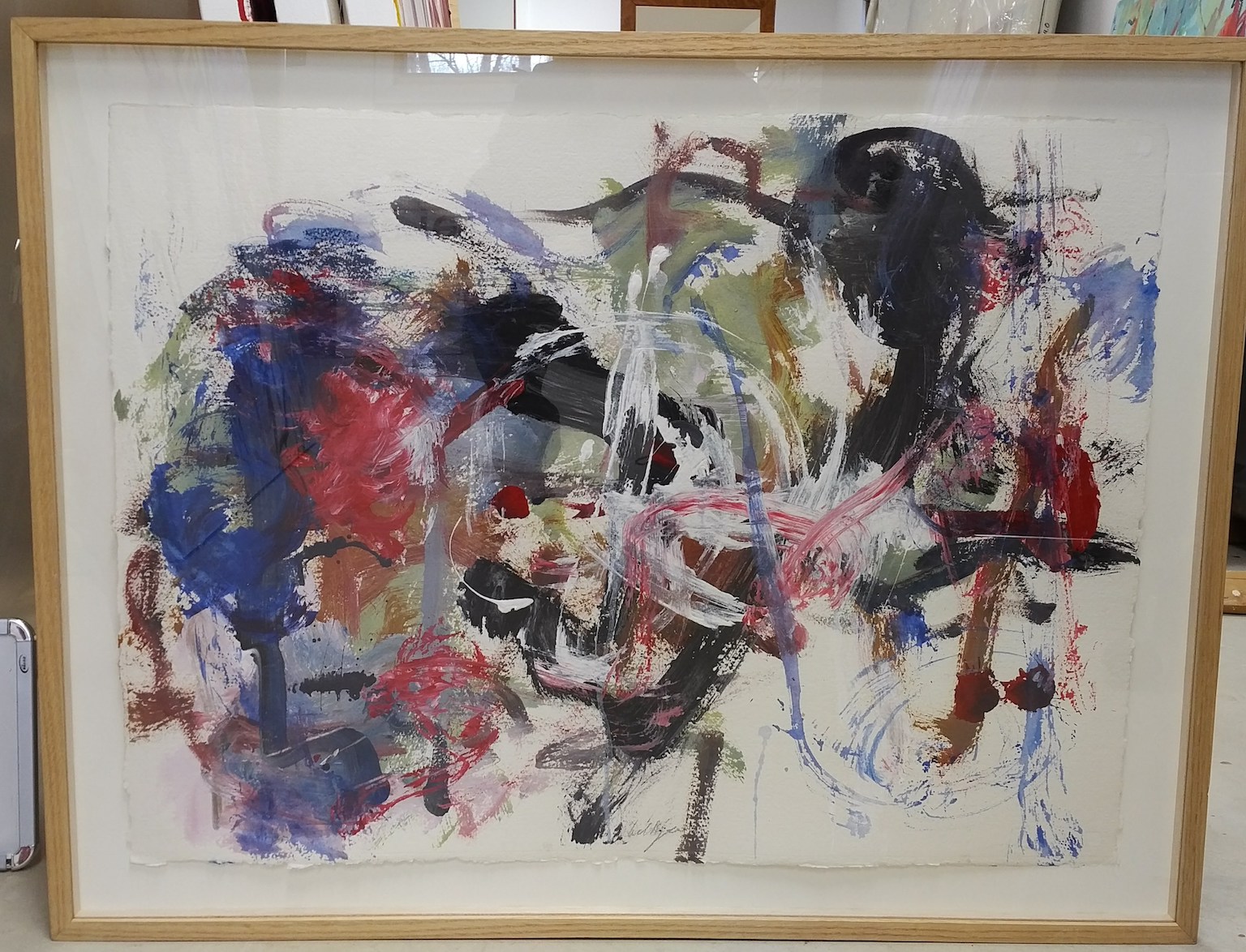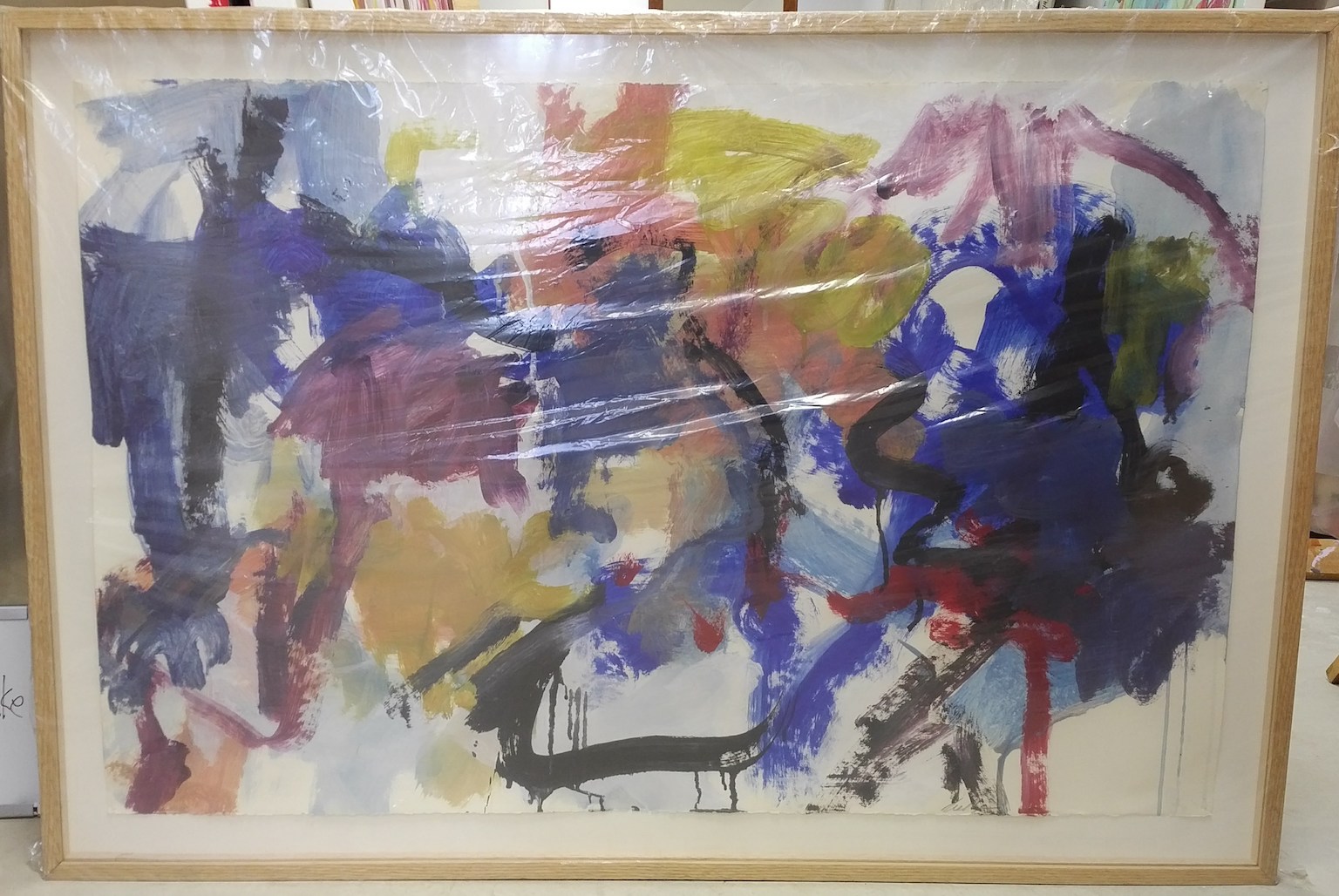 Large areas of color: blues, red, purples, greens, black. Blue and red drips in TL. Area of red across top and a vertical line L of C, interrupted by a black line in CL. Verso. Sticker on TC: Haunted By Being/ & Not Being / 93 #28. Gold sticker on BC: CUSTOM FRAMING AT LANNANS / Lannans Paint & Decorating Center / 184 East Burkitt Street / Sheridan, Wyoming 82801 / (307)672-8491.