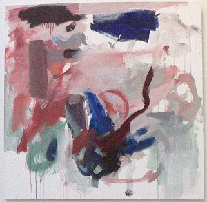 Colors are green, blue, beige pink, red, black, grey. A lot of white space. Beige and gray dripping. A horizontal gray line in CR drips a lot and is covered with pink. Verso. Stamped in TC vertical stretcher bar: 36. Sticker on C stretcher bar: NELTJE / But Who Remembers I / Acrylic on Canvas 1992 / 36" x 36" 26. Next to sticker: But Who Remembers I / 26/92. Stretcher used screws and can be keyed.