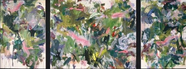 Triptych. Hang with 3 1/2 inches between panels. Primarily greens with dripping across bottom. 2 dark pink drips in CL. White space across bottom. Verso. TC vertical stretcher bar: 14/93 / A / Far / Back / Into / The / Hills. TR/CR vertical stretcher bar: outside. Stamped on CR stretcher bar: 32. On BC vertical stretcher bar: 48. Stretcher has screws and can be keyed.