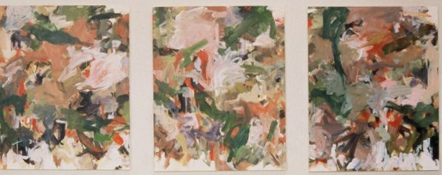 Triptych. Colors include tans, white, greens, purples, reds. Whitish area in CR. Drips across bottom. White space in TR and across bottom. Dark green, almost horizontal line in TC. Pinkish / tan color in C and TC. Verso. TC vertical stretcher bar: Top. C stretcher bar: A. CL stretcher bar: 41. Stamped on CL stretcher bar: 48. Stamped on BC vertical stretcher bar: 60. Stretcher has screws and can be keyed.