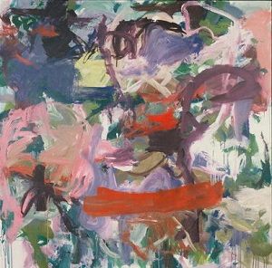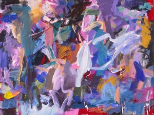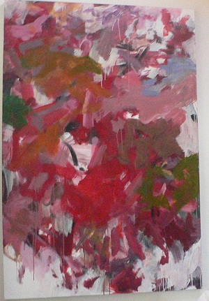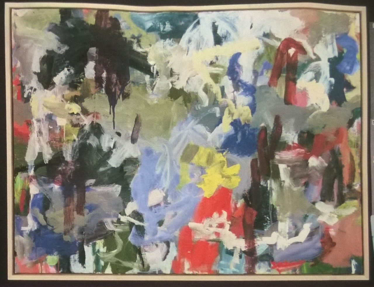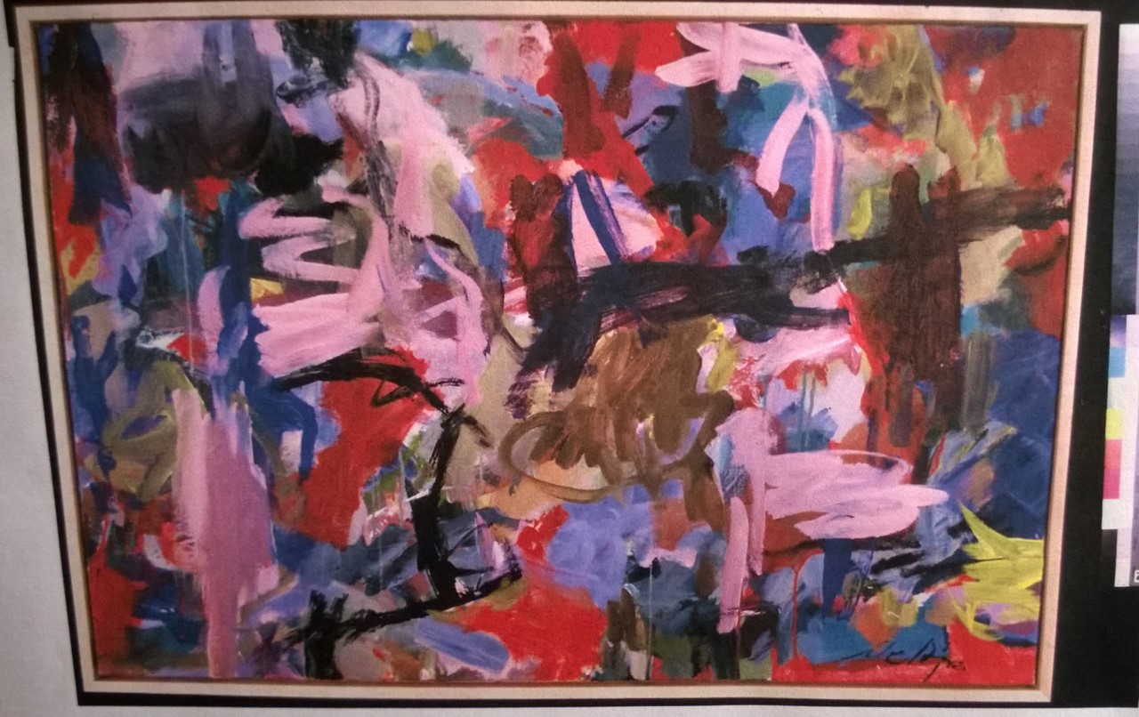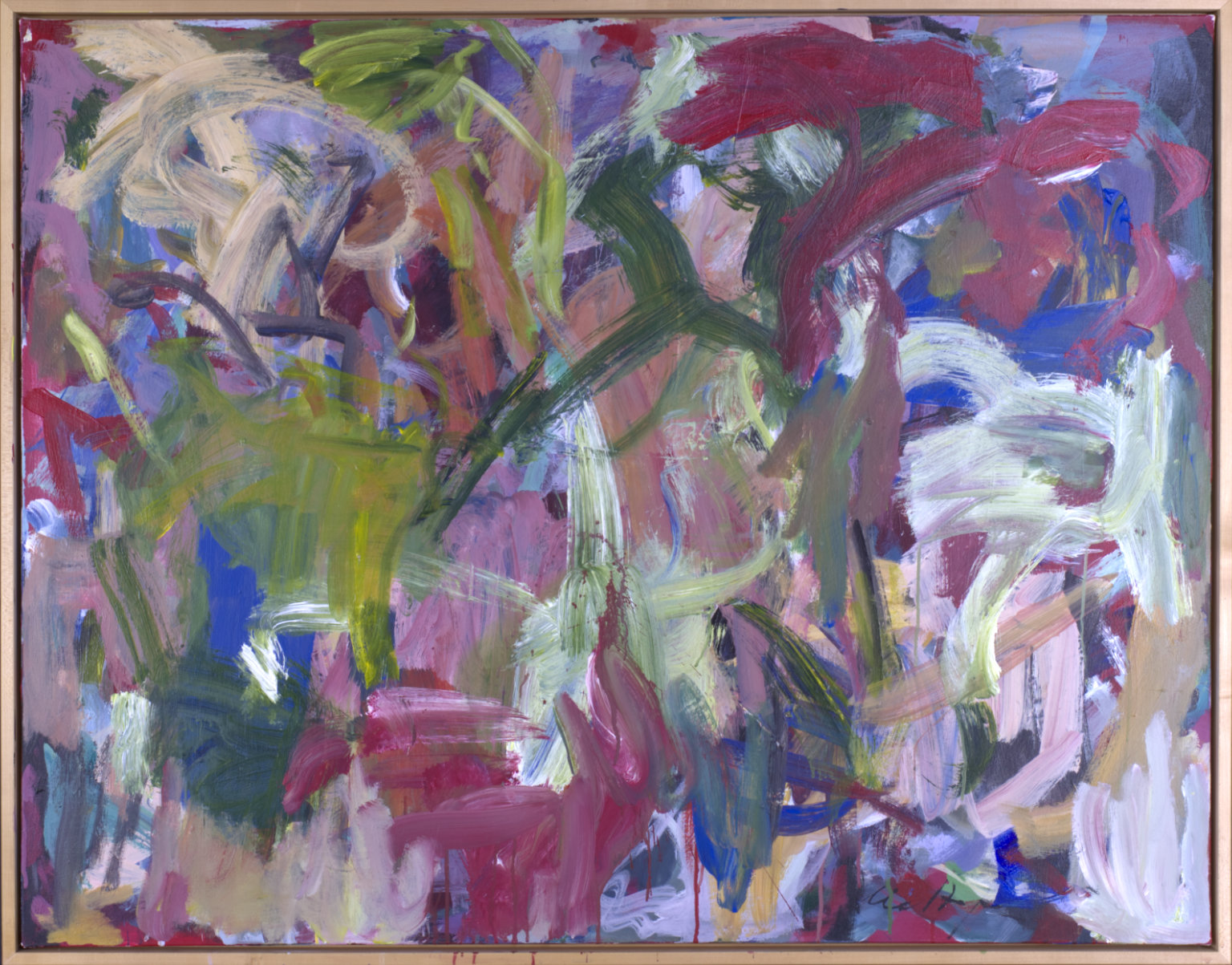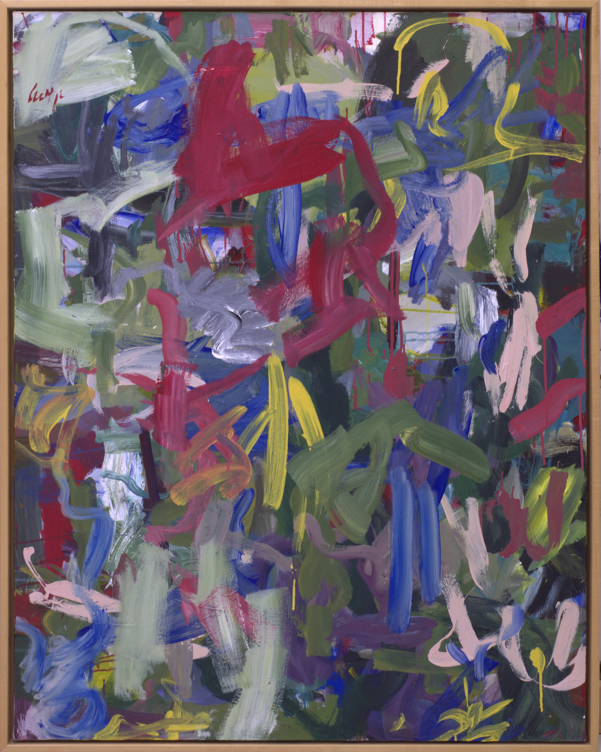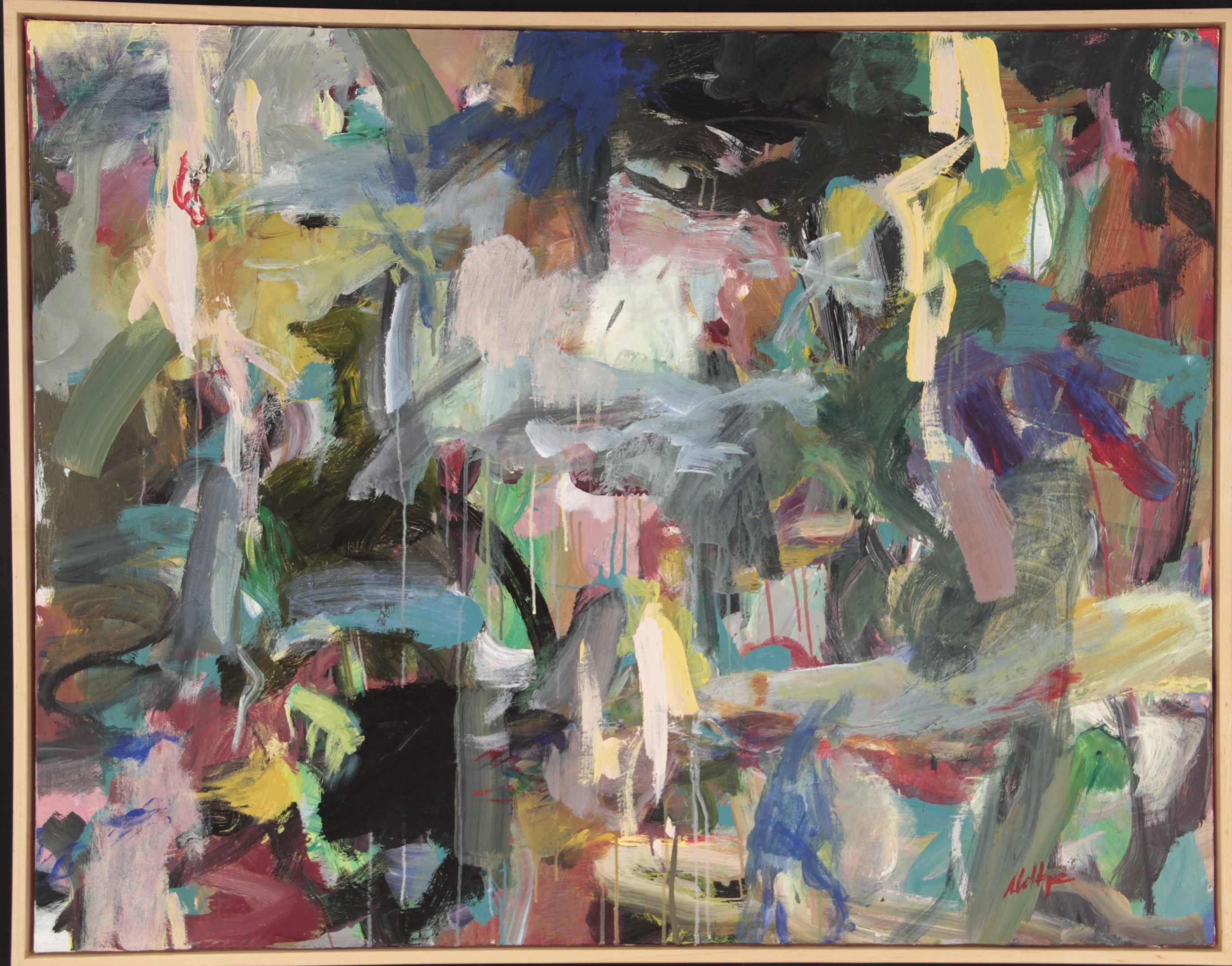 Multiple colors including greens, reds, pinks, tans, white. Dark pink spatters and drips in BC. CL has a lot of greenish-yellow with area of blue below. Verso. Sticker on TR frame: NELTJE Top / Sunday Morning Light / Acrylic On Canvas 1994 / 42" x 52" 7. TR canvas edge: SUNDAY MORNING LIGHT. Stamped on TC vertical stretcher bar: 42. Crossed out below: 24/93. Below: 7/94 / Sunday / Morning / Light. Stamped on CL stretcher bar: 54. Stretcher has screws and can be keyed.