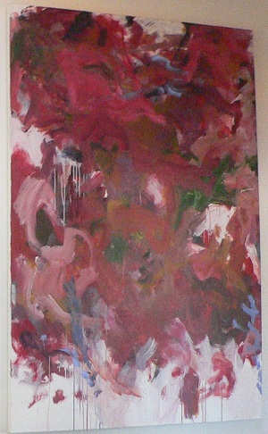 Diptych. Primarily reds with drips throughout. White space in BL and TR. Light pink drips in BR. Dark green in CL on edge, TC, and CR / BR. A little light blue in TR. Verso. TC vertical stretcher bar: Top / 6A / 93 / To <sic> Hot / For Daybreak. CL stretcher bar: <arrow> 6 inch space between elements. Next, crossed out: 31B / 92. Sticker, BR stretcher frame: NELTJE Top / Too Hot for Daybreak / Acrylic on Canvas 1993 / Diptych 72" x 102" 6. CL stretcher frame: Inside 6 inch space. TR Neltje 93. Stretcher has screws and can be keyed.