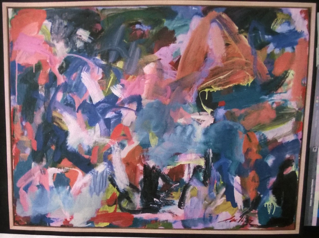 Multiple colors including blues, red, lavender, greens, yellow, black. Drips on L and across D and B. Horizontal pink and yellow in BR. Red drips in BL. Verso. Sticker on TC:CUSTOM FRAMING AT LANNANS / Lannans Paint & Decorating Center / 184 East Burkitt Street / Sheridan, Wyoming 82801 / (307)672-8491. Sticker on TR: NELTJE Top / Swimming After Midnight / Acrylic On Canvas 1994 / 34" x 54" 15.