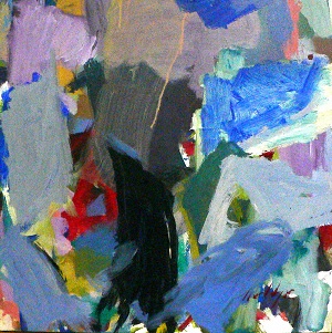 Colors are blues, greens, tans, reds. Purple area in TL. A little white space around edges. Black vertical area in C / BC. Red in CL / BL. Verso. TC vertical stretcher bar: 9/94 / Liquid / Day. Sticker: NELTJE Top / Liquid Day / Acrylic On Canvas 1994 / 26" x 26" 9/AC/1994. TL and BR stretcher frames: 24 x 24. Stretcher has screws and can be keyed.
