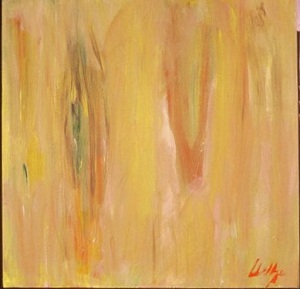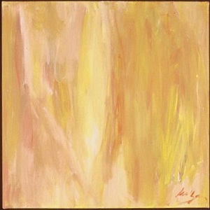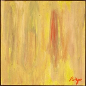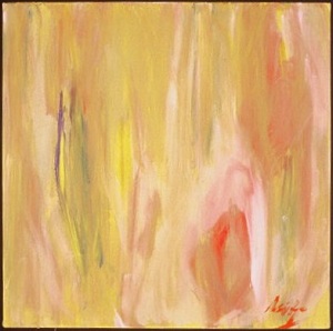 12 pieces - placement is bottom #2. Vertical yellows, pinks, greens. Blue line on L side. Area of darker pink in BR, wtih white to the R. Verso. C stretcher bar: 25/98. BL stretcher frame: 24 x 24. Stretcher has screws and can be keyed.