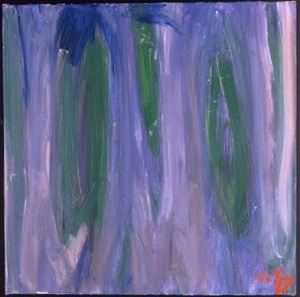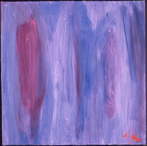12 pieces - placement is middle #1. Vertical blues and pinks. Pink area on L. Smaller pink areas in C and R. Verso. TC stretcher frame: 27/99. TL and BR stretcher frame: 24 x 24. Stretcher can be keyed.