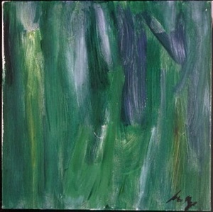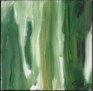 12 pieces - placement is middle #4. Vertical greens with some white. Some very dark green on R side. Verso. TC stretcher frame: 30/99. TR stretcher frame: 24 x 24. Stretcher has screws and can be keyed.