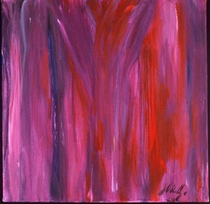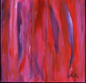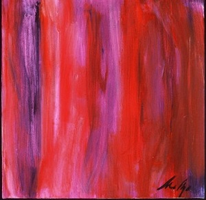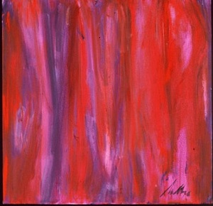 12 pieces - placement is top #4. Vertical pinks with some blues. Area on L edge is red. Verso. TC vertical stretcher bar: 34/99. BR vertical stretcher frame: 24 x 24. Stretcher has screws and can be keyed.