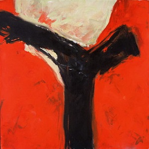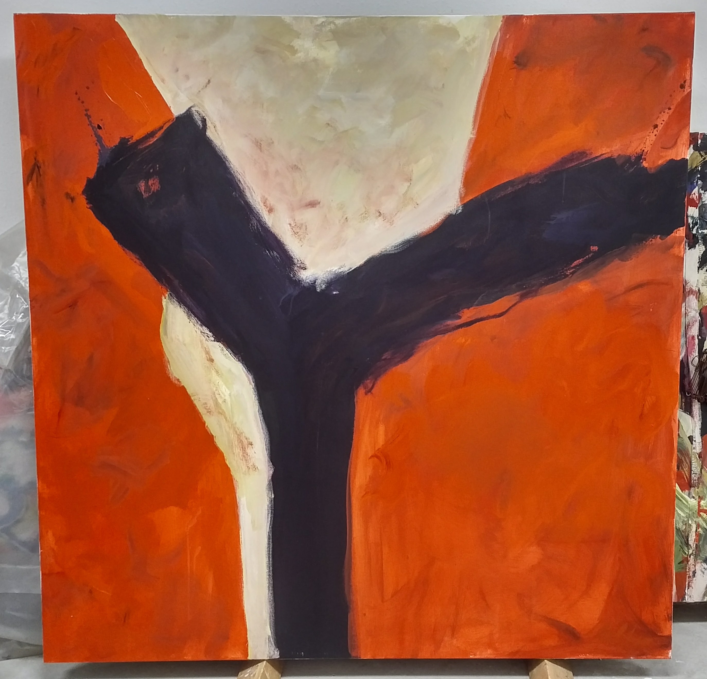 Red background. Black "Y" shape, from TL to C to BC to C, ending in TR/CR. Tan / green area in TL / TC, and a line of same colors on side of "Y" in CL. Verso. TC vertical stretcher bar: Forced / Entry / 32/2K. Stamped below: <symbol> DEAD <symbol> STRAIGHT. CL stretcher bar: 55 3/4.