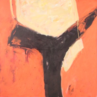 Red background. Black "Y" shape, L arm in CL, bottom in BC, R arm in TR. Green / yellow / pink area in T with 3 drips into black in CR. Black spatters across bottom. Verso. TC vertical stretcher bar, crossed out: Intent. Below: Keep / Your Hands / Of Me / 33/2K. Below: 55 3/4 CR stretcher bar, stamped: <symbol> DEAD <symbol> STRAIGHT.