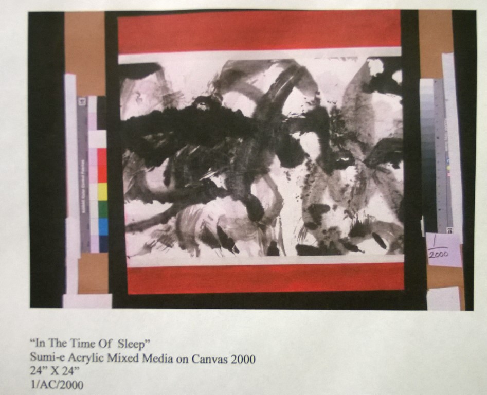 Wide, red borders on T and B. Masking tape border on T and B of paper across middle. Black and gray (sumi-e) on paper, with white space. Horizontal black in CL / C. Verso. TC vertical stretcher bar: 1/2000 / In The / Time of / Sleep. Stamped on BC vertical stretcher bar: <symbol> DEAD <symbol> STRAIGHT. CL stretcher bar: 19 3/4.