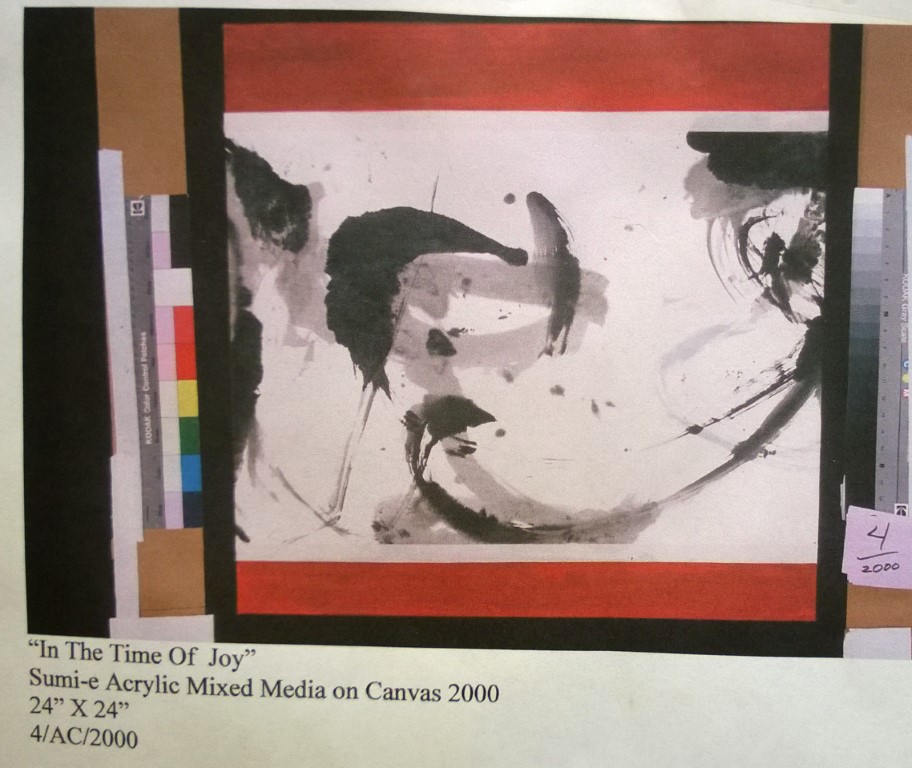 Wide, red borders on T and B. Masking tape border on T and B of paper across middle. Black and gray (sumi-e) on paper, with a lot of white space. Dark area in TR. Curved line from CR into BC. Verso. TC vertical stretcher bar: 4/2000 / In / The Time / of Joy. Below: 19 3/4. Stamped, CL stretcher bar: <symbol> DEAD <symbol> STRAIGHT. Sticker, CR stretcher bar: NELTJE Top / In The Time Of / Joy / Sumi-e Acrylic Mixed Media / on Canvas 2000 24" x 24".