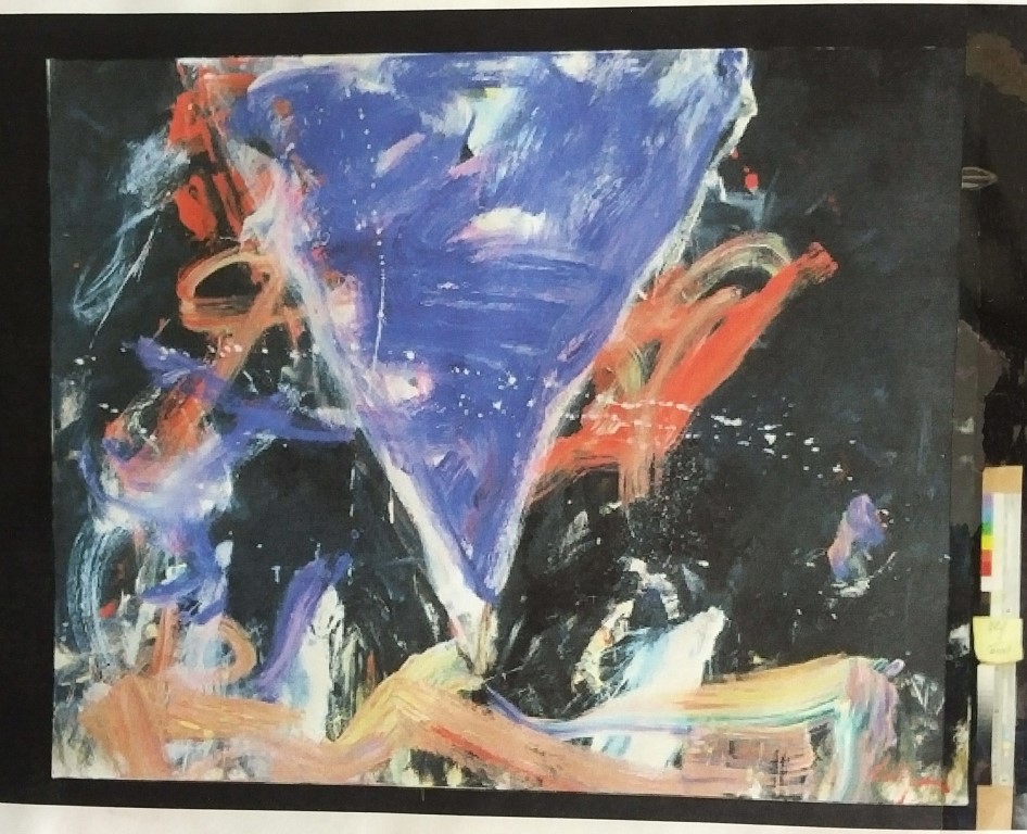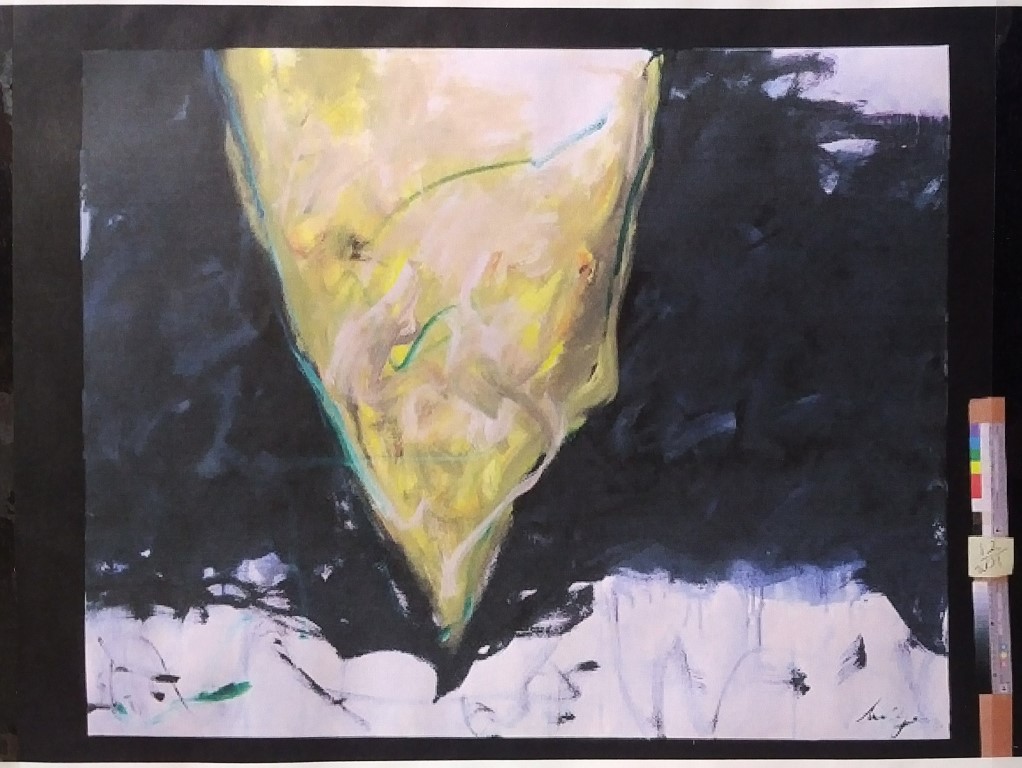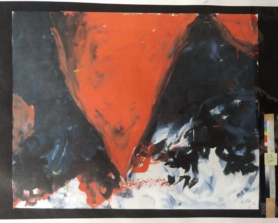 Red background. Black "Y", L arm starts in CL, R arm in TR / CR, bottom in BC, joining in C. Pink / green / tan area in TC with a strip along dark area in CL / BL. Black spatters in TL and TR. Verso. TC vertical stretcher bar: 21/2K / Scarred / Edge. Below: 55 3/4. Stamped upside down on CL stretcher bar: <symbol> DEAD <symbol> STRAIGHT.