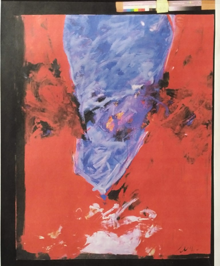 Blue triangular shape, wide at top, narrow in BC. Dark strip along L edge and bottom. Background is red. A little yellow-red in C. Dark drips across bottom. Verso. TC vertical stretcher bar: 6/01 / You / are / Looking / Into The / Wrong / Window. Stamped, upside down, CL stretcher bar: <symbol> DEAD <symbol> STRAIGHT. CR stretcher bar: 43 3/4. BC vertical stretcher bar: 55 3/4.