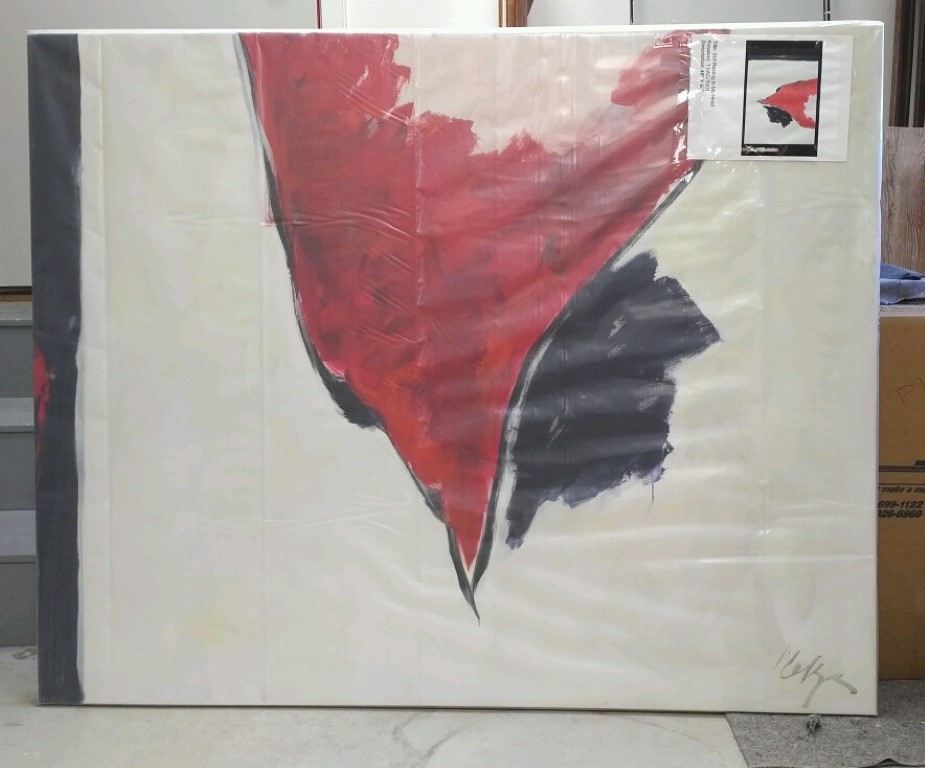 Dark background. Red triangular shape, wide at top, comes to a point in BC. Red paint spatters below tip. White and gray across bottom. Red area in TR corner. Verso. TC vertical stretcher bar: 13/01 / A Chest / Full of / Bones. Stamped below: <symbol> DEAD <symbol> STRAIGHT. Sticker on C stretcher bar: NELTJE Top / A Chest Full Of Bones / Acrylic on Canvas 2001 / 48" x 60" $5,000.00 13. Sticker: Neltje / 11 Lower Piney Creek / Banner, WY 82832 / (307)737-2226. Upside down on CL stretcher bar: 55 3/4.