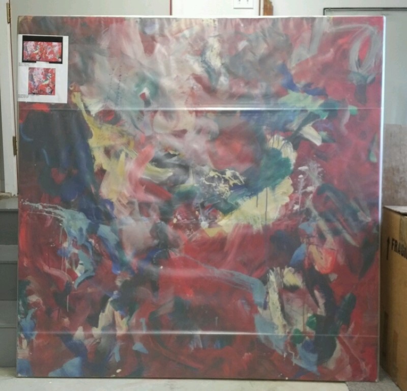 Diptych. Primarily reds. Pink area in TL / TC. Blue spatters throughout. Blue drips on R side. Tan and white spatters in C. Red spatters in TC. Verso. Crossed out on TC vertical stretcher bar: 15 B / 10 / 01 / When / I / Cannot / Talk. Below: 15A / 01. Below: 55 3/4. C stretcher bar: "September 11, 2001" Neltje. Stamped, CR stretcher bar: <symbol> DEAD <symbol> STRAIGHT.