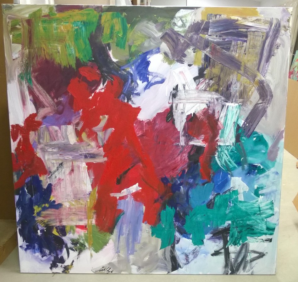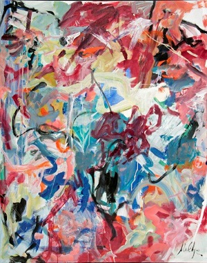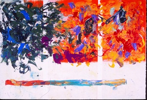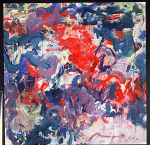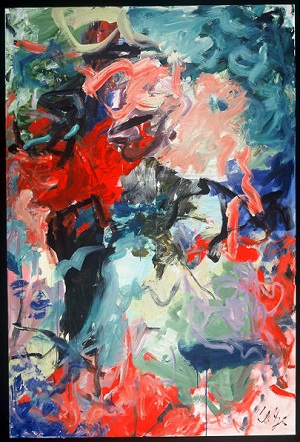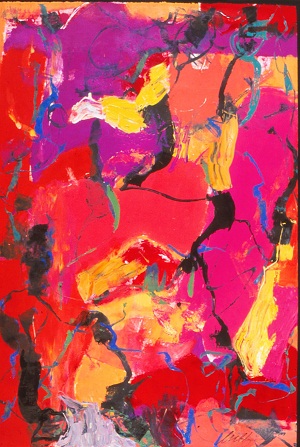 Primarily blues and reds with tans, yellow, greens. Green drips throughout. Large red area in TC / C. Pink "arrow" shape in TL pointing up. Verso. TC vertical stretcher bar: 38/02. CL stretcher bar, stamped upside down: <symbol> DEAD <symbol> STRAIGHT.