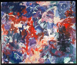 Multiple colors including blues, reds, greens, black. TR is primarily blues. Area of red in CL. 2 blue drips in BR. Black signature over pink in BR. Verso. TC vertical stretcher bar: 47/02. Stamped on CR stretcher bar: <symbol> DEAD <symbol> STRAIGHT.