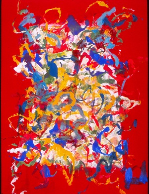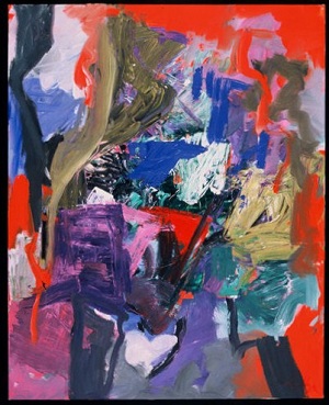 Red vertical area in TC / C. Red area, with horizontal brush strokes, in CL / BL. Blue drips in BC. Blue in BR. Green / yellow brush strokes in TR. Verso. TC vertical stretcher bar: 43/02. Stamped below: <symbol> DEAD <symbol> STRAIGHT.