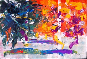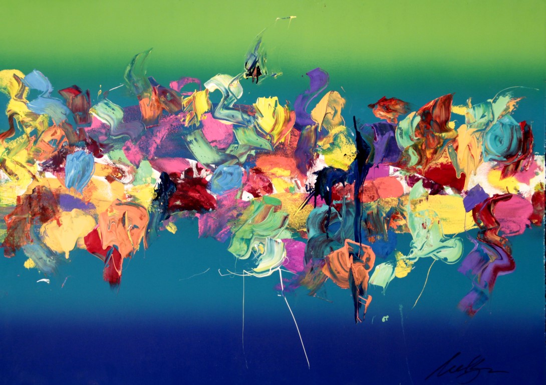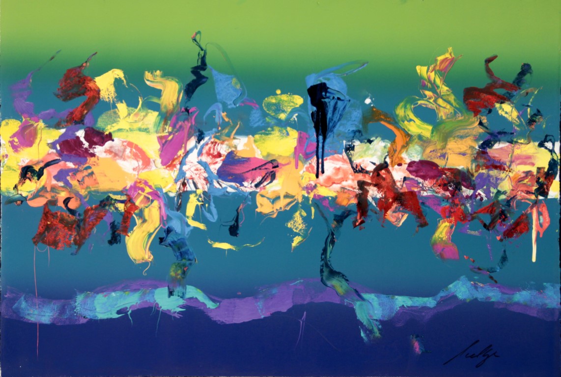 Deckle edge paper. T 1/4 is green. Middle 1/2 is teal. B 1/4 is blue. Colorful area across C. 2 white spatter lines in BC. Peach and reddish drips in CL. Verso. BL: 41/02. Watermark BR: BFK RIVES / FRANCE <symbol>.
