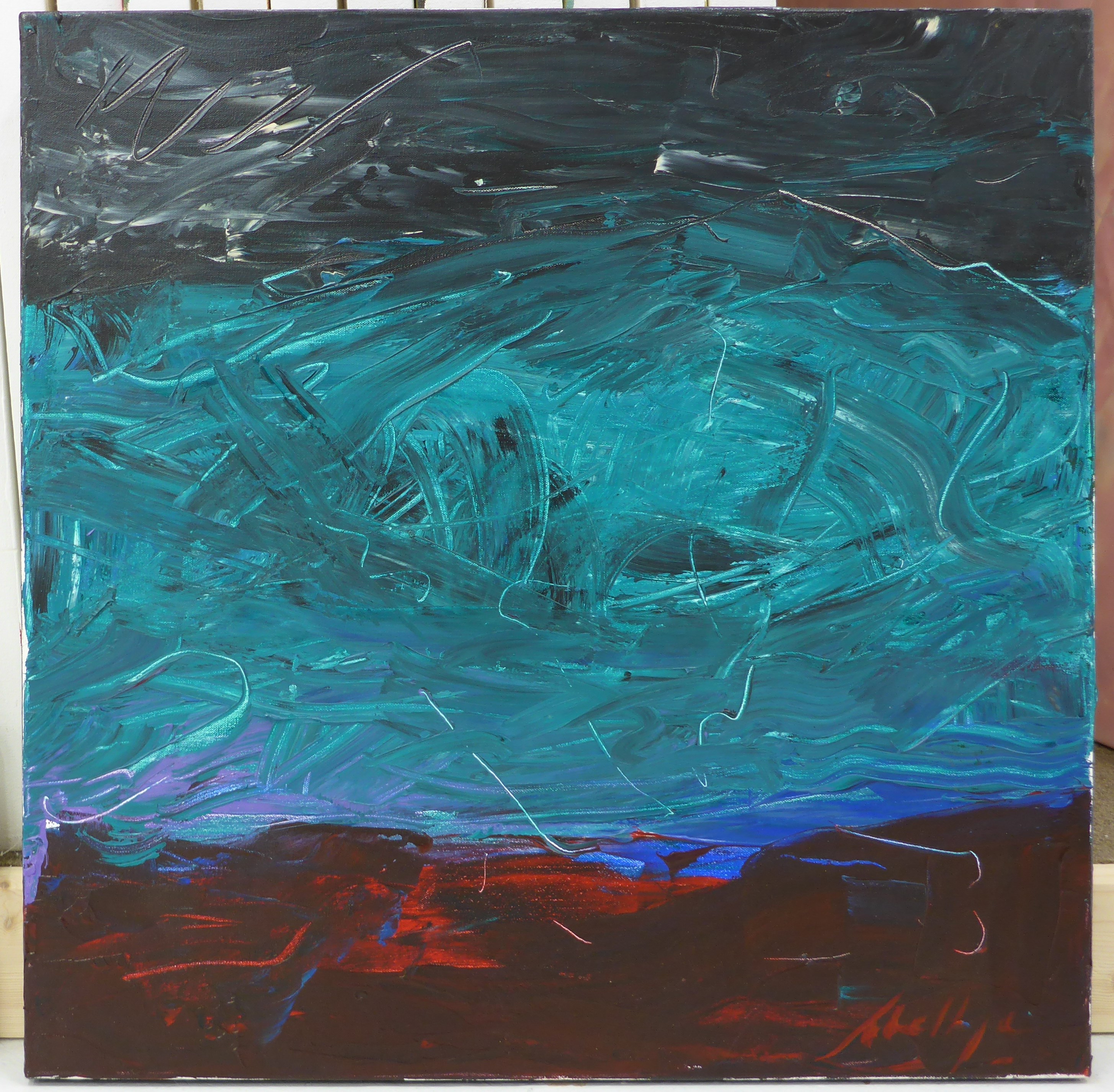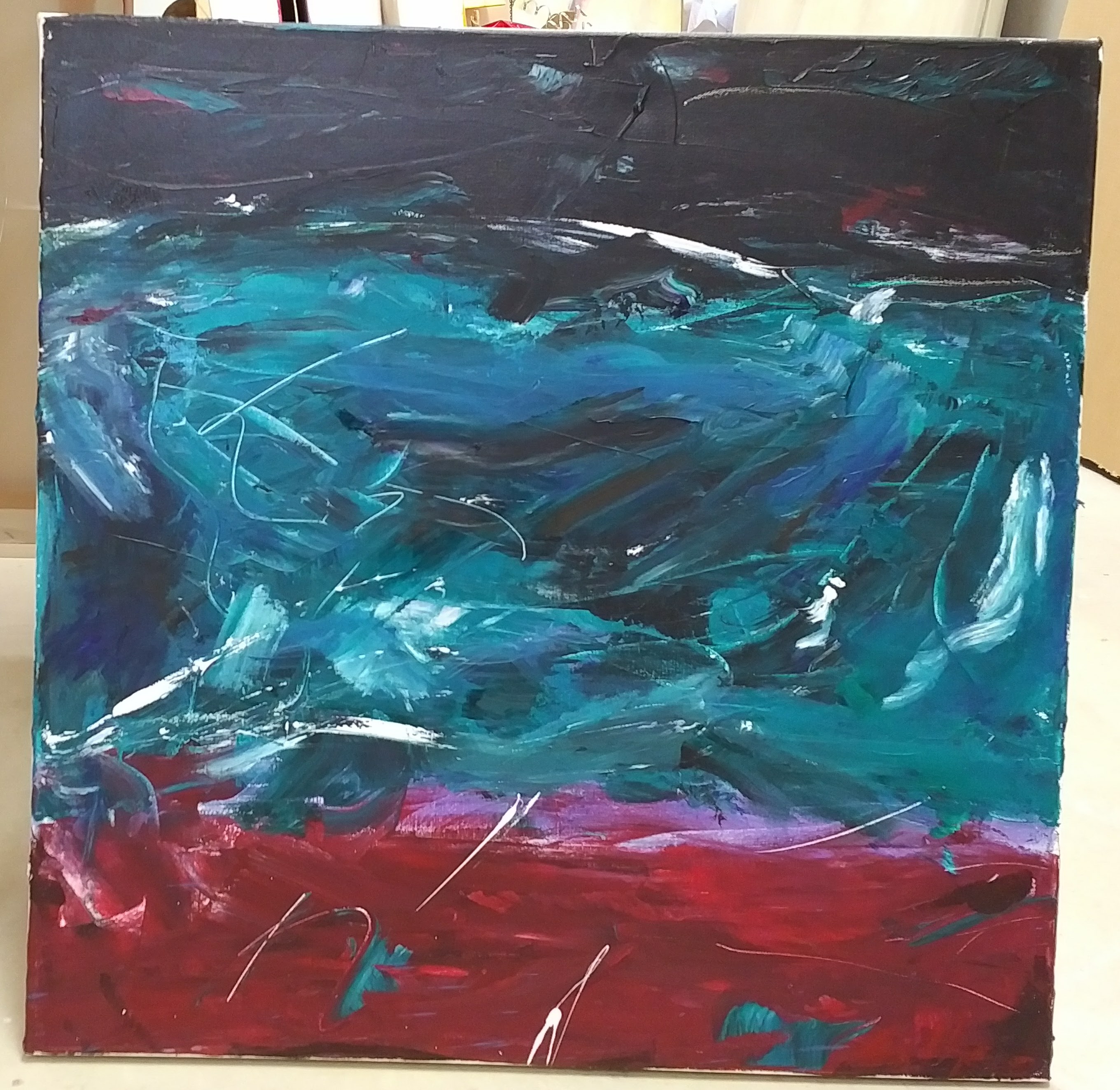 Reds across top. Dark across C including black, blues, reds, pinks. Teals across bottom with black and blues. Vertical white streaks primarily on right, a little in C on left. Heavy paint use. Verso. In pencil on vertical TC stretcher bar: Because / You / Refused / 2003 12/03. Stamped on CR stretcher bar: <symbol> DEAD <symbol> STRAIGHT.