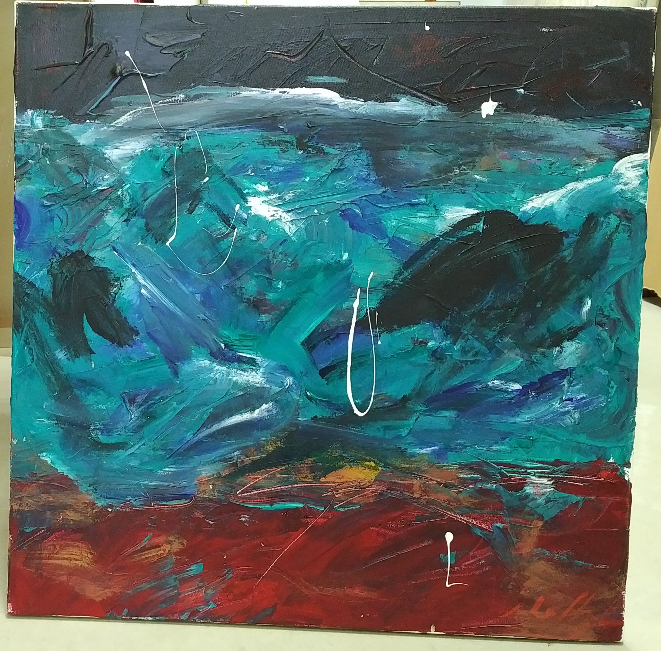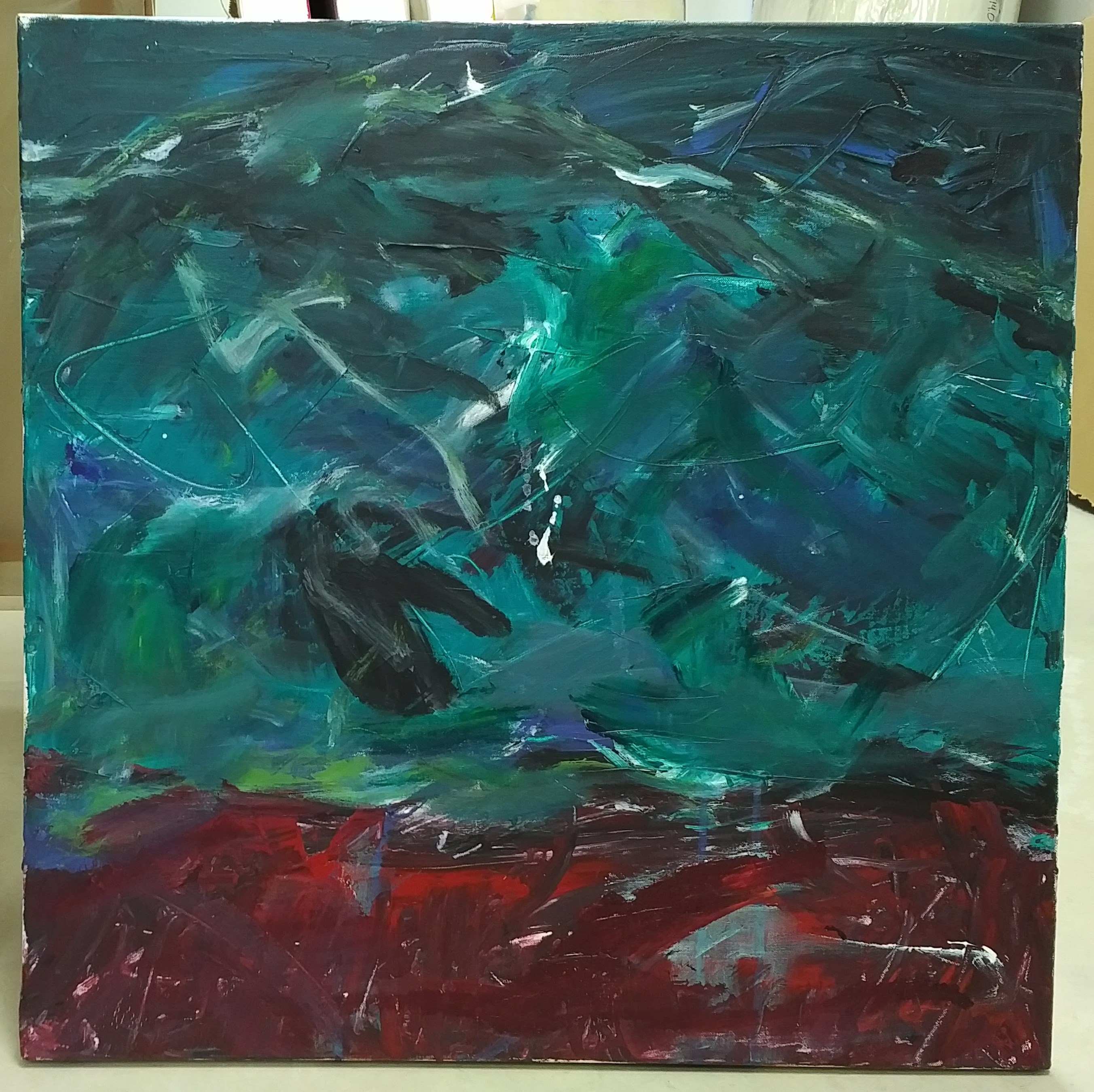 Dark border across top. Red border across bottom. Greens and blues through C. White spatters. Areas throughout with intentional scratching to expose canvas. Verso. TC stretcher frame: How Love Ruins You 2002 32/02.