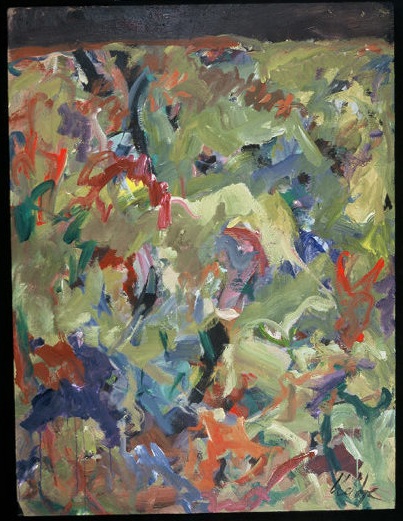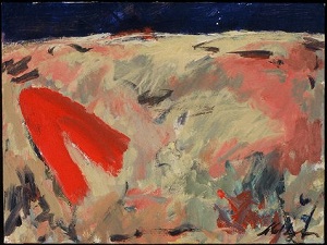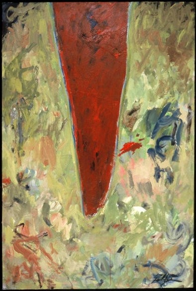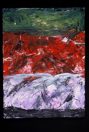 Deckle edge paper. Green across top, with a little yellow. Primarily red across C. Lavender below. Dark strip across B. A few small white spatters. Verso, backing board. Sticker TL: Bradford Brinton Memorial / (307)672-3173 / 239 Brinton Road, P.O. Box 460 / Big Horn, Wyoming 82833 / Exhibition: 15th Annual Holiday Show / Date: December 2-23, 2005 / Title of Work: I Am Unaquainted with Anyone / Artist/Lender: Neltje / Notes: . TC sticker: NELTJE / I Am Unaquainted With Anyone / Acrylic On Paper 2002 / 30" x 22" 27. Covered stickers in TR and CR.