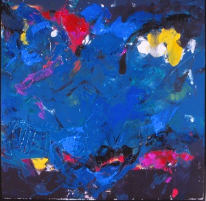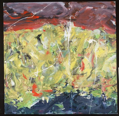 Reds and grays across top. Horizontal middle section is largest of 3 sections and is primarily yellow. Blues across bottom. White drips and spatters on surface. Verso. In pencil on TC vertical stretcher bar: Elation / and / Defeat / 2003 13/03. Sticker under writing: NELTJE Top / Elation & Defeat / Acrylic On Canvas 2003 / 48" x 48" 13A2003. Crossed out in C on stretcher bar: 2/01 Error of Judgement. BC of stretcher: <bar code sticker>. In marker: 48. Corners of stretcher have metal adjusters and can be keyed.