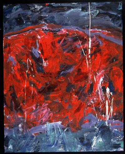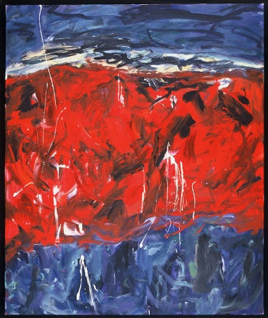 Top and bottom quarters are primarily blues and black. Middle half is reds. White paint spatters across. In TL there is a black horizontal line with 2 drips. Verso. In pencil on TC vertical stretcher bar: It / Is / A / Question / ? / 2003 / 6/2003. Crossed out on CR stretcher bar: 22/2K / Last Night / When I / Broke. Stamped, upside down, on CL stretcher bar: <symbol> DEAD <symbol> STRAIGHT. In pencil 60" 55 3/4. BC vertical stretcher bar: 67 3/4.