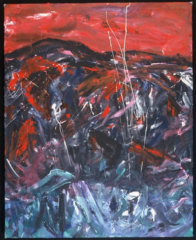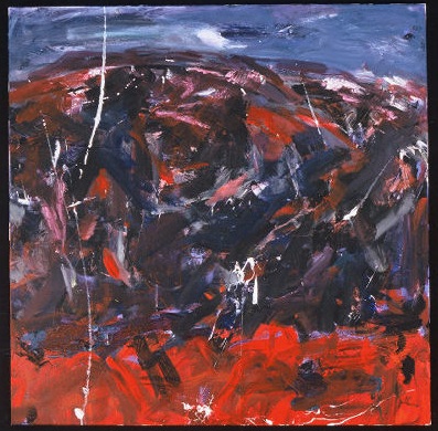 Primarily black, green, and red. Top quarter is black, middle 3/4 is green, bottom quarter is red. Thick paint has been scratched through to expose some of the canvas pattern. There is a little blue and purple between the green and red. Verso. On TL stretcher bar: I Couldn't Make It New Again / 2002 33/02.