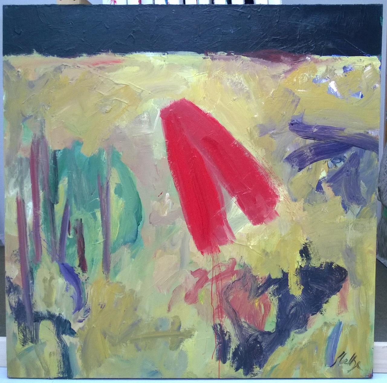 Strip across top is mostly black. Rest of painting is muted colors: greens, blues, reds, black. Some colors are dripping. CL has a dot of yellow with area of dark red on left and mauve on right. Verso: In marker, crossed out, on TC vertical stretcher bar: 14/98 69/03. Illegible words in red are crossed out. Below in marker: A Blizzard / Of Slashed / Feelings. Mostly illegible stamp in C on stretcher bar: DAVID DAVIS / illegible / illegible N.Y.C. 10012. CL on canvas edge is an arrow and: "Money or Music" - crossed out. In pencil, crossed out, on CL stretcher bar: 43/05.