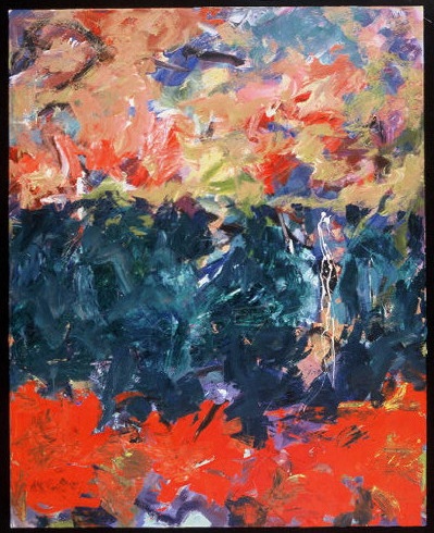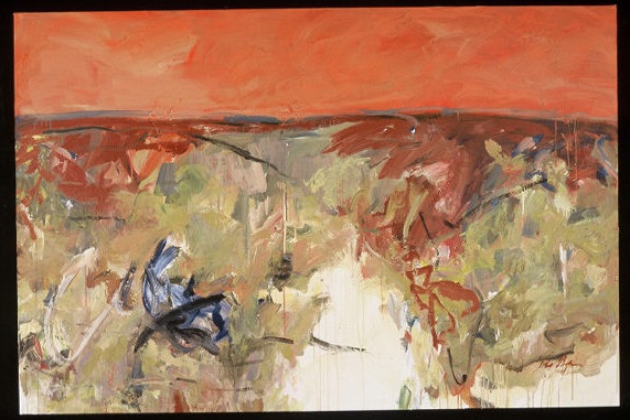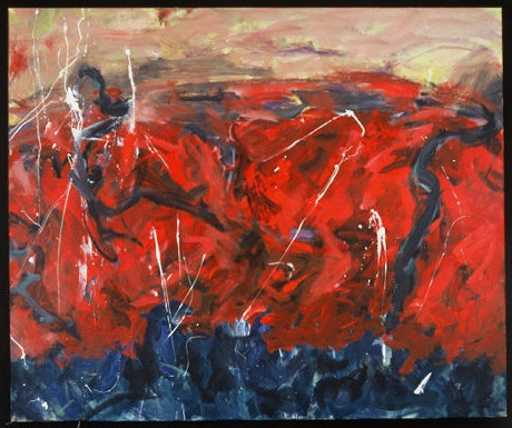 Primarily reds across center. Blue and black across top. Blues across bottom. Vertical streaks of white on right from top, almost to bottom. Vertical streaks of white on left in center. Heavy paint use. Verso. TL vertical stretcher bar: Ready / to / Leap / 2003 / 8 / 03. Sticker on C stretcher bar: Neltje / Read to Leap / Acrylic on Canvas / 2003. Stamp on CL stretcher bar: <symbol> DEAD <symbol> STRAIGHT. Crossed out on CR stretcher bar: illegible numbers / 2000 / Not a Good / Place to / Hide. On BC stretcher bar: 55 3/4.