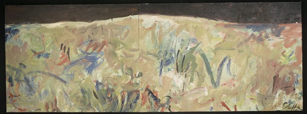 Diptych. Strip of dark reddish paint across top. Multiple colors: beiges, blues, greens, gold, reds. Light blue circle in C, brown, green, and purple below. Verso. In marker on back of canvas TL, crossed out: Another scene of choices / N.Y. 1992. In red marker on TC vertical stretcher bar: Guides / By Dream / s. Crossed out underneath: Another / Scene of / Choice. Underneath: A. Group of numbers, crossed out, below. Underneath in marker: 76B/2003. In center on stretcher bar: A. Illegible stamp in C.