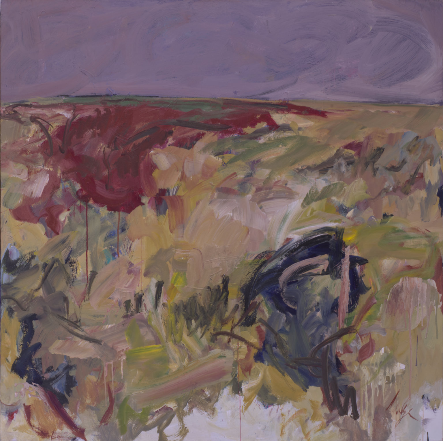 Top quarter is lavender, bottom 3/4 is tans, red, blues, and greens. CL has an area of red with a line of green across the top. BR has an area of blues with a little pink and green. Verso. Sticker on TC stretcher bar: NELTJE Top / My Heart Tumbles / Acrylic On Canvas 2003 / 60" x 60" 93A2003. In red marker on the TC vertical stretcher bar: 93/2003 / My / Heart / Tumbles / 2003. Piece of masking tape on canvas TC: Billings. On CR stretcher bar: 60.