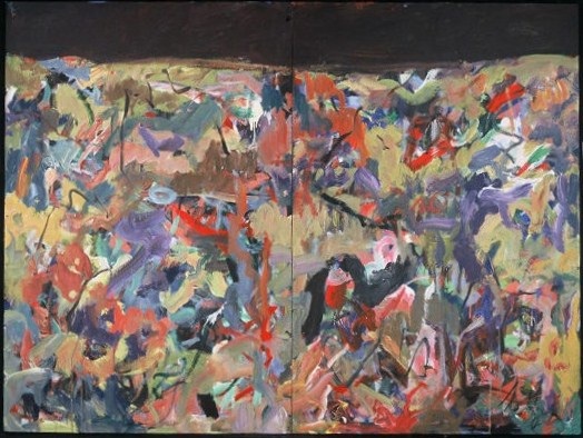 Diptych. Strip across top is dark, reddish / black. The rest is tans, greens, reds, and blues. C has 3 short, vertical black lines with some red below. Verso. In marker on C stretcher bar: 75A/2003. Numbers crossed out on CL stretcher bar: 3/96 25A/98. On BC stretcher bar: 48 x 60.