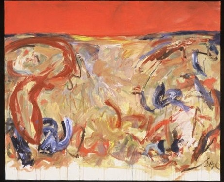 Blue paint with a little white across top. Darker colors through middle, horizontal section including blues, reds, and grays. Bottom is primarily red. White streaks and spatters on left side, BC, and CR. Verso. Crossed out on TC vertical stretcher bar: 5/01 4/01 Contemporary Context. Beneath in pencil: I have / a desire / to eat / lamb / chops / 2003 15/2003. Stamped upside down on CL stretcher bar: <symbol> DEAD <symbol> STRAIGHT. Crossed out on C stretcher bar: Contemporary Context.