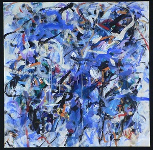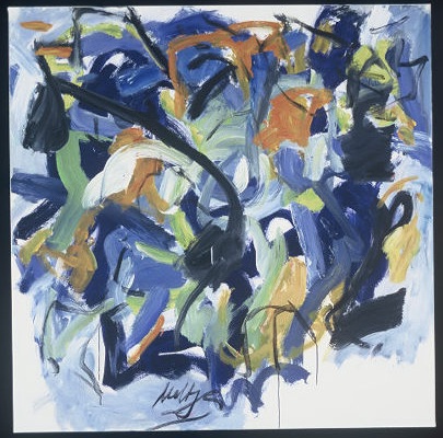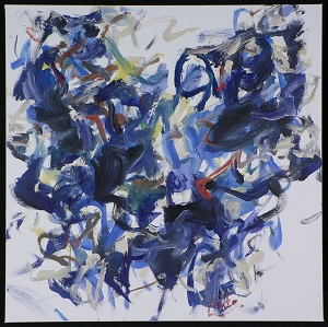 Primarily blues with black, white, red, yellow, green, and browns. White and light blue drips in CL and C. Darker blue drips in TC. Verso. In pencil on TC vertical stretcher bar: NELTJE Top / In Light Shadow / Acrylic On Canvas 2005 / 48" x 48" 21/AC/2005. In pencil on CL stretcher bar: 43 3/4. Stamped on CR stretcher bar: <symbol> DEAD <symbol> STRAIGHT. Tag hanging next to stamp, identical tag attached to form: BOLD EXPRESSIONS Please type or print / Name Neltje / Address 11 Lower Piney Creek Rd / City Banner / State WY Zip 82832 / Telephone (307) 737-2226 / Tile of Entry Price or Value if NFS / In Light Shadow 3,500.00 / Media Acrylic On Canvas / Social Security Number XXX-XX-XXXX / WHERE THE CRATE WILL BE SHIPPED / Name Neltje / Address 11 Lower Piney Creek Rd / City Banner / State WY Zip 82832 / Name of the Shipper that will pick up your work: / Federal Express / NCA, Inc. is a non-profit organization, a member of the Sacr / artists.