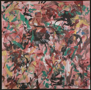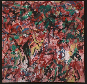 Primarily red with some green, yellow, blue, black, and white. Some white space in BL and BR, with red paint dripping through white paint spatters. Some short, vertical blue lines in TC. Verso. In pencil, upside down, on TC vertical stretcher bar: 73. Underneath, in marker, right side up: 36/2005. Upside down on CL stretcher bar: 67 3/4 <symbol> DEAD <symbol> STRAIGHT.