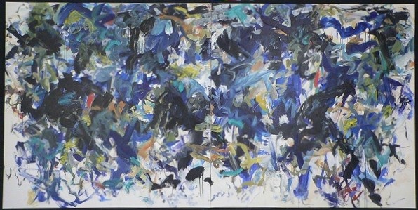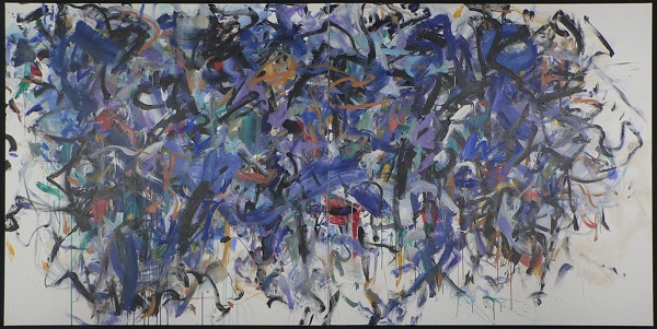 4 pieces. Blues, lavender, black with a lot of white space. Lighter colored drips throughout. 2 drips on L and one on R go from TL and TR to bottom edge. Verso. Signed on back TL: Neltje 3/05. Stamped on CL stretcher bar: <symbol> DEAD <symbol> STRAIGHT. Next in C: 33A/2005. Next on CR: BREEZE DANCE A.