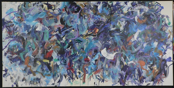 Diptych. Primarily blues with greens, yellows, black, and white. White space in TL corner and in CL, BL, and across B. Line of red in C, interrupted by black. Verso. On TC vertical stretcher bar: 13A/2005 January/2005 A Difficult / Time To / Be Wise Panel A / Diptych. Upside down on CL stretcher bar: 67 3/4. Upside down on CR stretcher bar: <symbol> DEAD <symbol> STRAIGHT.