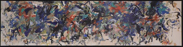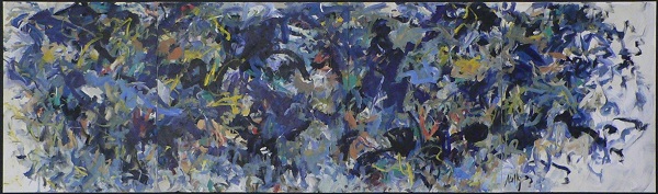 White space in TC, BL, and BR. Colors are blues, reddish gold, greens, and black. "M" shape in black in BC with black paint running into white space. Verso. In pencil on TC vertical stretcher bar: Gem Me My Cigar 19/05 / Feb. Stamped on CL stretcher bar: <symbol> DEAD <symbol> STRAIGHT. In pencil on CR stretcher bar: 43 3/4.