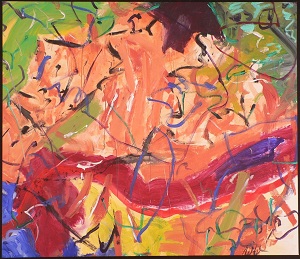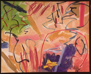 Predominantly reds, pinks, orange, and yellows. TC and C has a vertical area of lavender. C has an angled line and U-shape in blue. Metallic gold in TL and CR. Verso. In marker on TR on canvas: OPEN YOUR EYES 2/06. In marker on TL vertical stretcher bar: 13 AC/2006. Below is a sticker: NELTJE Top / Open Your Eyes / Acrylic On Canvas 2006 / 57" x 80" 13/AC/2006. In pencil on CL stretcher bar: 75 3/4 2.