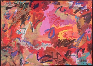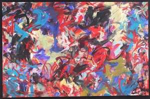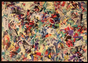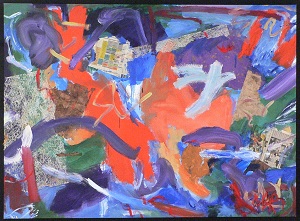Primary colors are pinks, orange, and blues. Mixed Media material is hand-made paper and foreign language newspaper. Newspaper in TL / TC appears to be a TV listing. Hand-made paper in CL / BL has red, blue, and white paint on top of it. *Changed in 2011. Paint added, especially dark red around the edges and BR. Dark green lines throughout. **Changed again. None of the newspaper shows through anymore. Black drips from C into BC. Peach in TL / TC / BR. Verso. In red marker on TC canvas edge: 78 x 57. On TR vertical stretcher bar in marker: 28AC / <numbers crossed out> 16AC/2006. In pencil, upside down, on CL stretcher bar: 80 3/4.