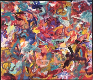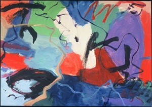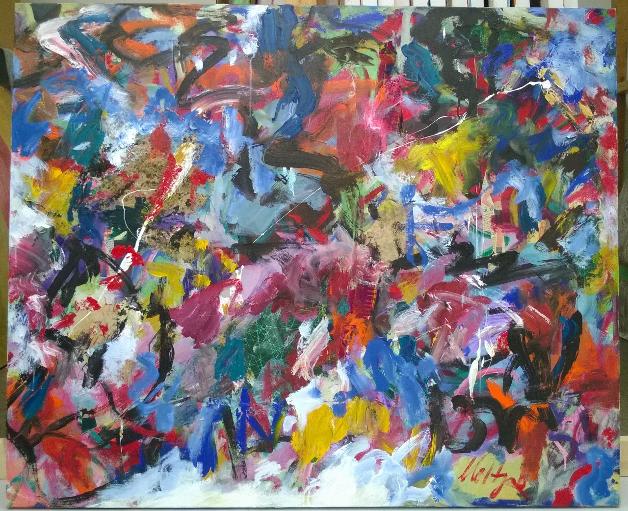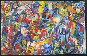 Multiple colors including reds, yellows, blues, greens, purple, and tans. C is reds and pink with red drips. BL is red, light and dark blue, purple, and yellow with black and green lines. * Additional painting done 1/2011. Yellow with drips on L. Red with drips in C and BC. Yellow diagonal from TL to C. Light blue area in CR. **Changed again. Light blue through yellow diagonal. CR has more red now. Purple area in TC / C. ***Changed again in 2011. Red and yellow drips still visible. Teal throughout. Purple in TC / C with red over it. Verso. In marker on TC stretcher bar: 27 AC 2006 66 x 57 (red). Sticker on C stretcher bars: NELTJE Top / When Is Never? / Acrylic On Canvas 2006 / 66" x 57" 27/AC/2006. In pencil on BC vertical stretcher bar: 52 3/4.